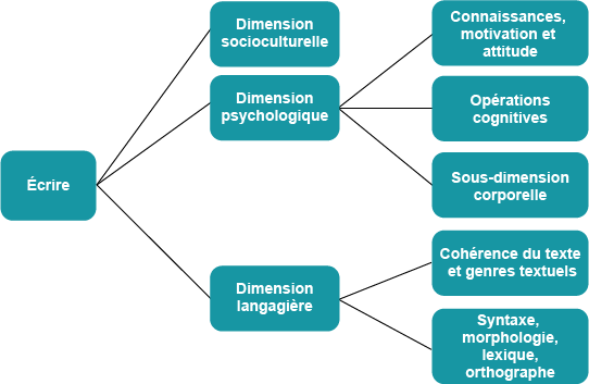 Enfin, écrire inclut les dimensions langagières du français que sont la syntaxe (la construction adéquate des phrases), la morphologie (les règles d’accord), le lexique (le vocabulaire) et l’orthographe (écrire adéquatement les mots selon la norme). D’après Simard et coll. (2010), ce sont des dimensions « transversales » de l’écriture parce que le scripteur doit en tenir compte, peu importe le texte qu’il doit écrire et le contexte de communication.