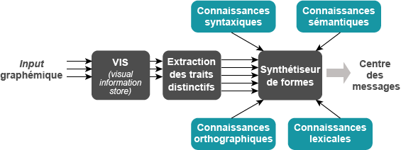 1. La première étape favorise l’extraction des « traits distinctifs des lettres à partir de l’information stockée en mémoire visuelle » (Fayol, 1992, p. 25) comme c’est le cas dans le modèle ascendant de Gough (1972). La boite VIS (visual information store) du modèle de lecture de Rumelhart (1977), que l’on peut traduire par « emmagasinement d’informations visuelles », représente la mémoire visuelle.